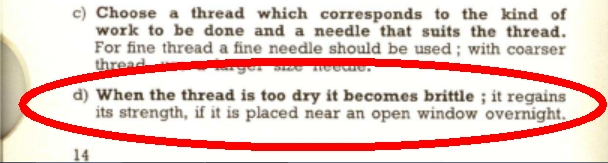 When thread is too dry it becomes brittle; it regains its strength, if it is placed near an open window overnight.
